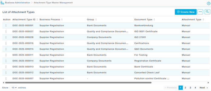 The Attachment Type Master Management section allows you to define the file formats (extensions) that suppliers can upload during the registration process. You can create, view, edit, activate, or deactivate attachment types as needed.