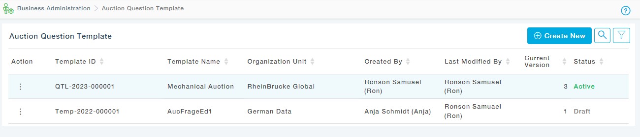 The purpose of this feature is to define Question Templates, provide an ability to the Buying Organization to reuse the questions in the form of templates. These templates can be used while creating an Auction, under the Question and Answers tab. These templates can be created through Auction Question Templates submenu under the Business Administration Main Menu on the left side navigation pane.