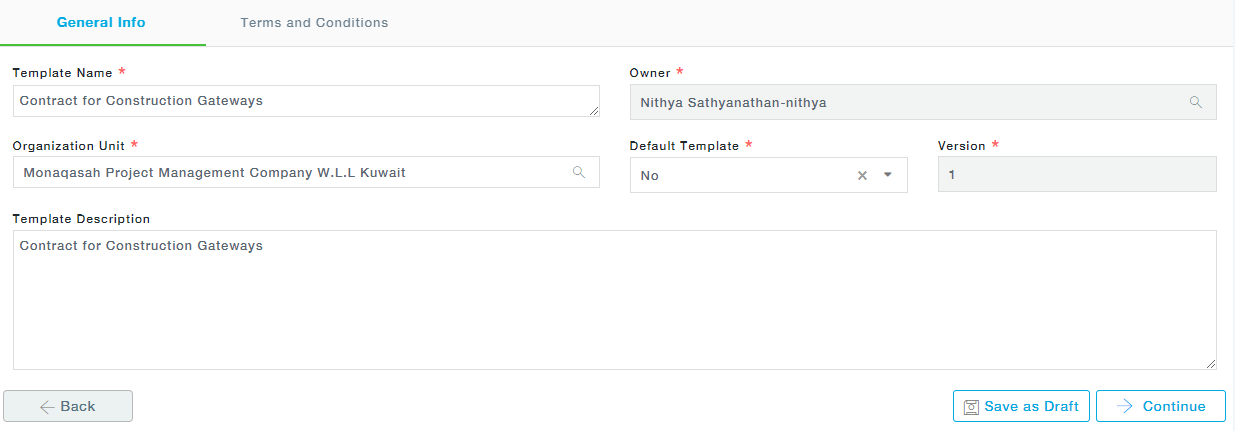 - Enter the template details in the General Information tab and click on the Continue button to move to the next tab.