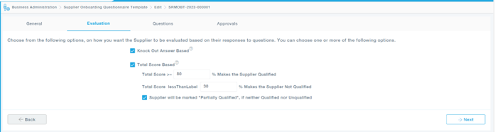 Evaluation Tab: Provides how the suppliers are evaluated, either by total score based or Knock out based. The scores can be modified accordingly.