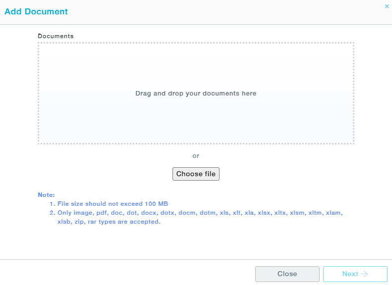 You can either drag and drop the file or click on the Choose File button. The points that need to be noted are provided as a Note on the screen. The Note includes the file size and the type of files that can be uploaded. Click on the Choose file option.