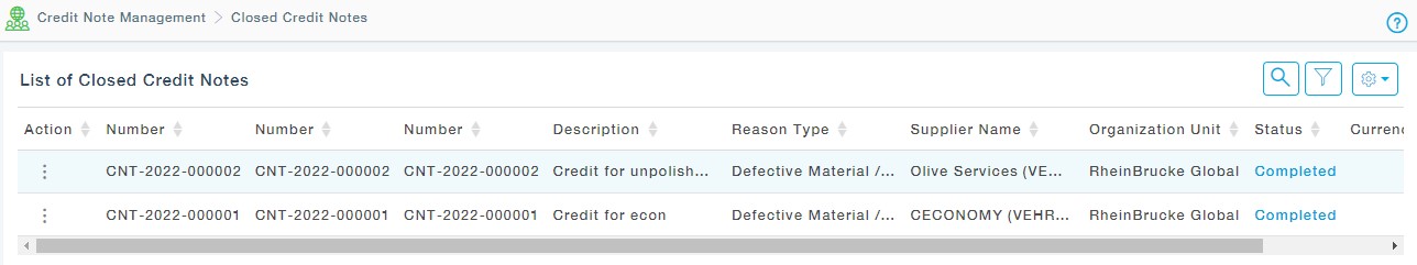 All the credit notes that have been approved by the Supplier and then posted by the Buyer will move to the list of closed credit notes. You can view the details of the Credit note by selecting the View Action.