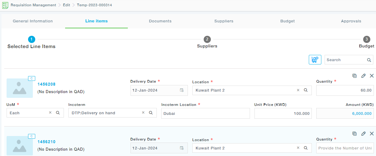- Quantity: Specify the number of items required
