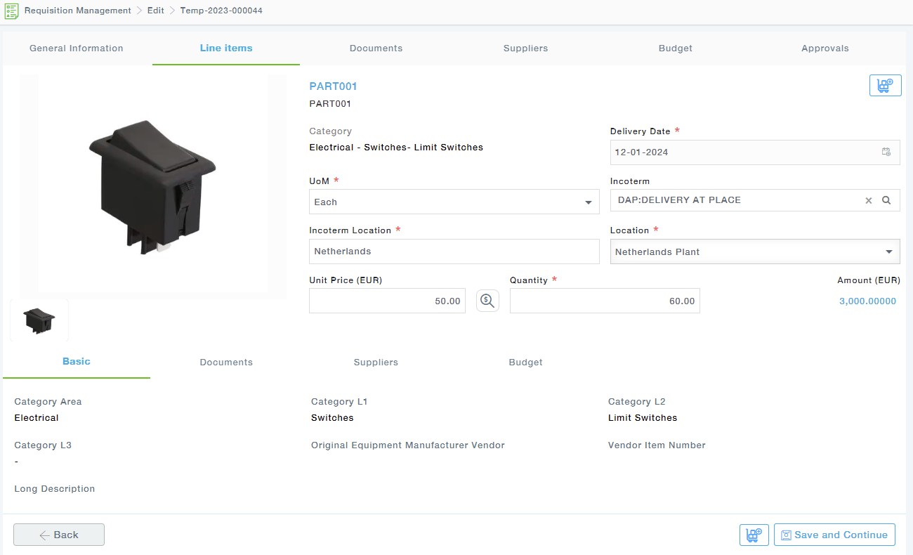 Provide the details of all the selected items and click on the Save and Continue button to move to the Suppliers tab.