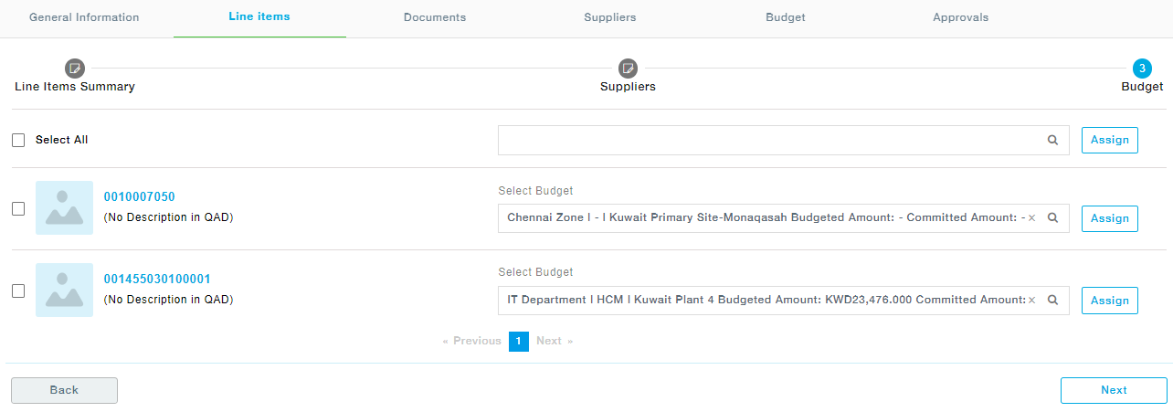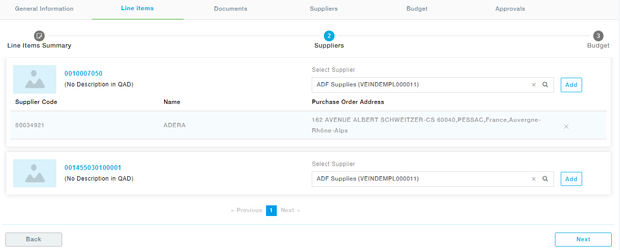 Select the supplier from the dropdown and click on the Add button. You can map more than one supplier to the item. Once all the suppliers are mapped to all the items, click the Next button to move to the Budget section.