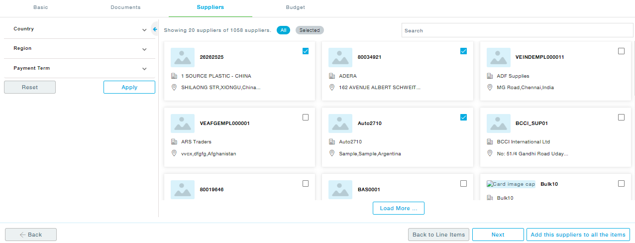 - Suppliers: Add the filters in the left side and see the available list of suppliers. Choose one or more suppliers and click If you wish to get these suppliers added to all the items you are going to select under this requisition, click on the Add selected suppliers to all items.