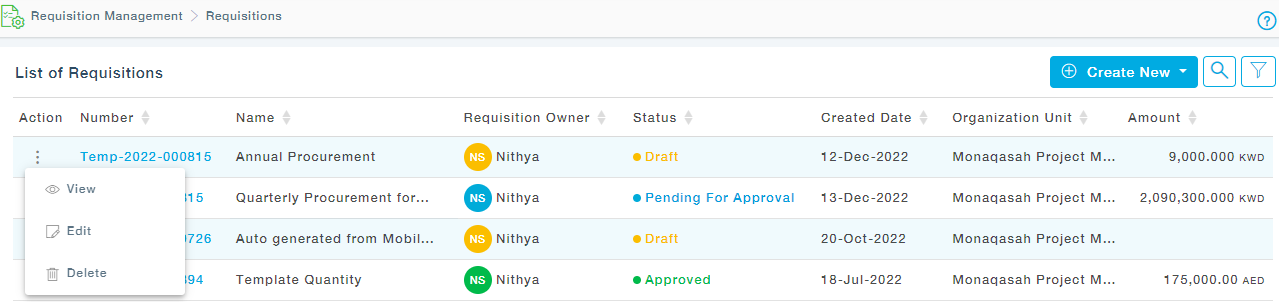 NOTE: As already seen in the Requisitions section, actions are displayed based on the status of the Requisition. For a Requisition in Draft state, the Delete option is made available. You cannot delete the Requisition once it is submitted for approval.