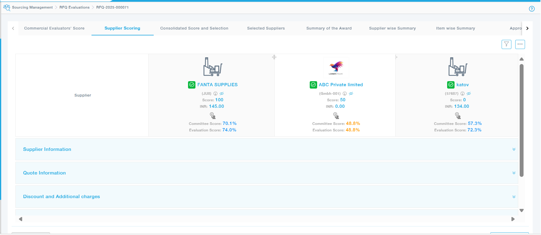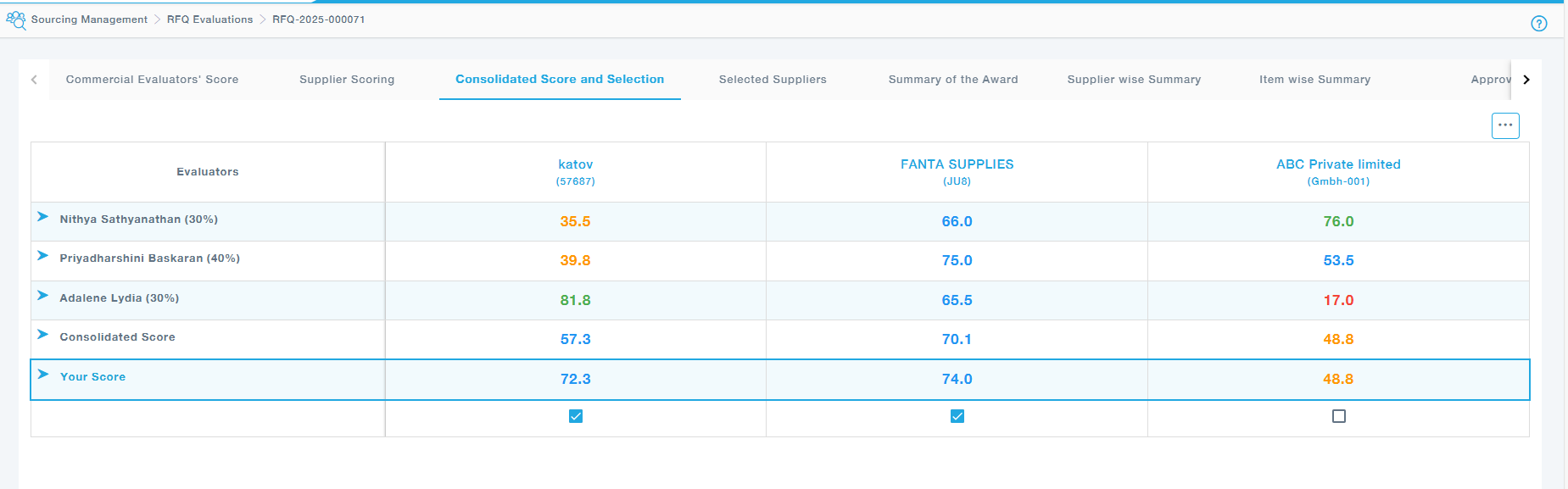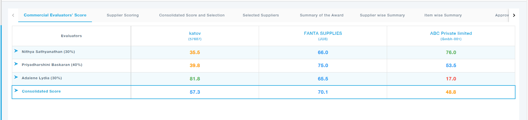 Here, all evaluator scores are displayed side by side, allowing for an overall comparison. Based on the combined scores and other factors, suppliers are selected for potential awarding.