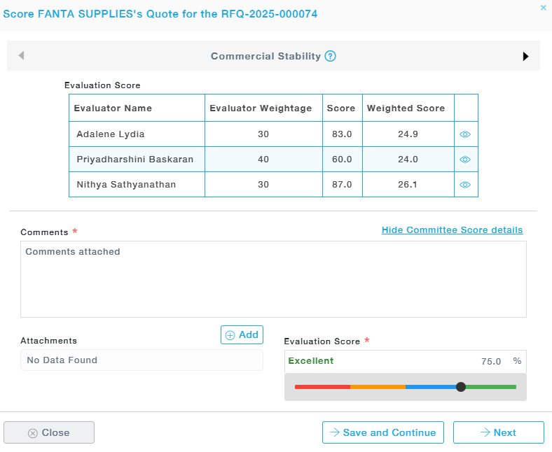 The Chief Commercial Evaluator reviews evaluators’ scores and weightages, then assigns an overall score and comment for the supplier to finalize the commercial evaluation.