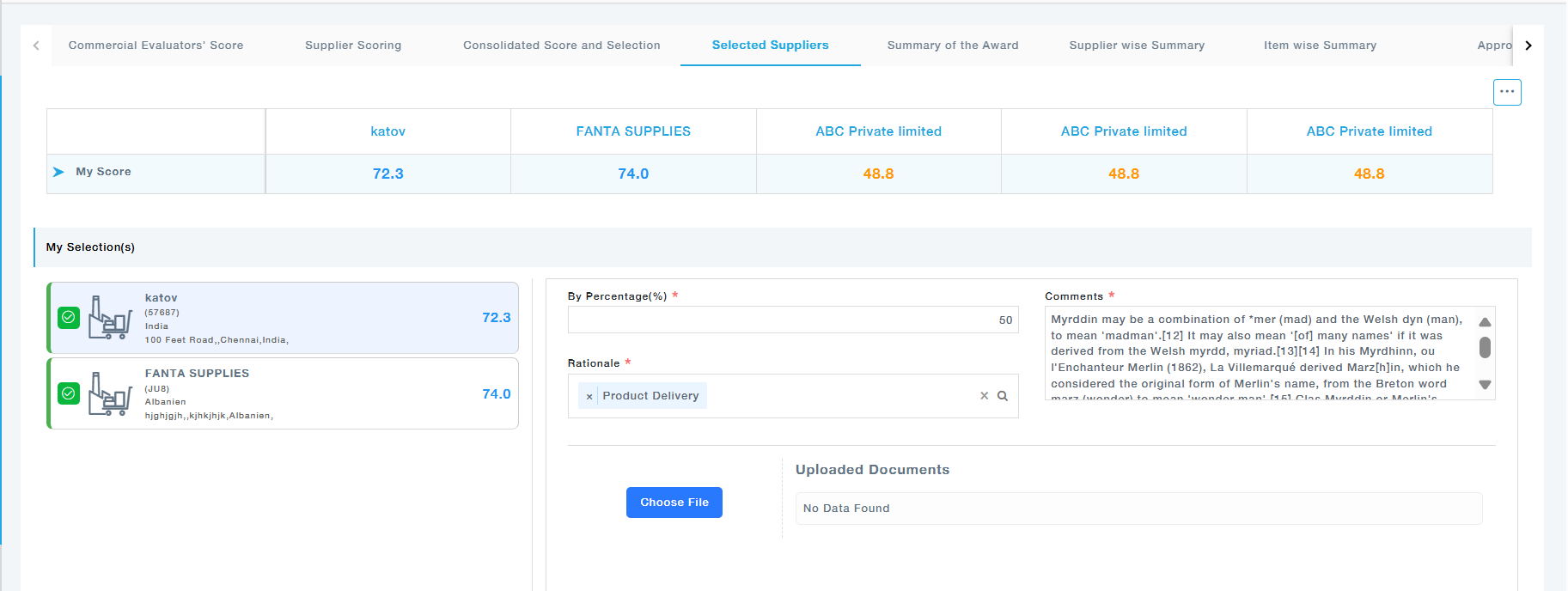 Once suppliers are selected, the percentage of the award to be allocated to each is entered. The rationale for their selection is provided along with evaluator comments to justify the decision.