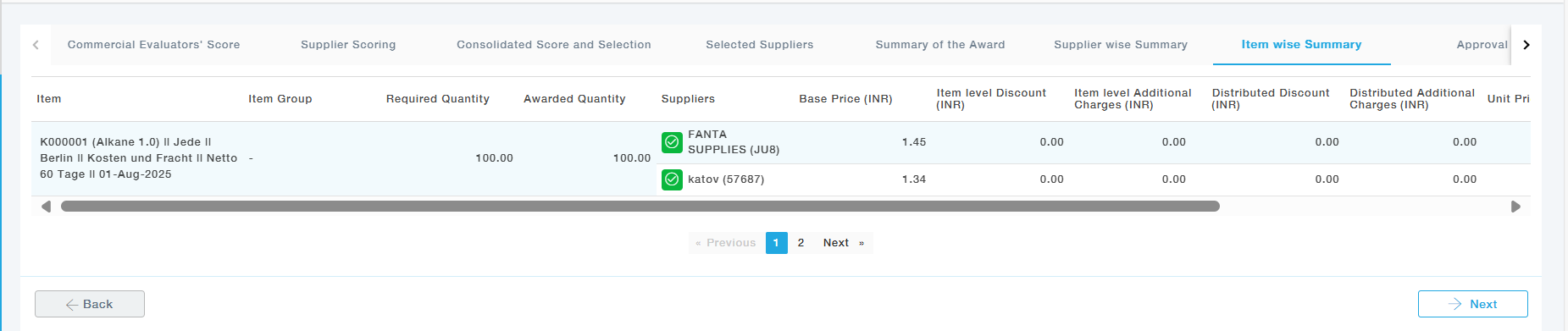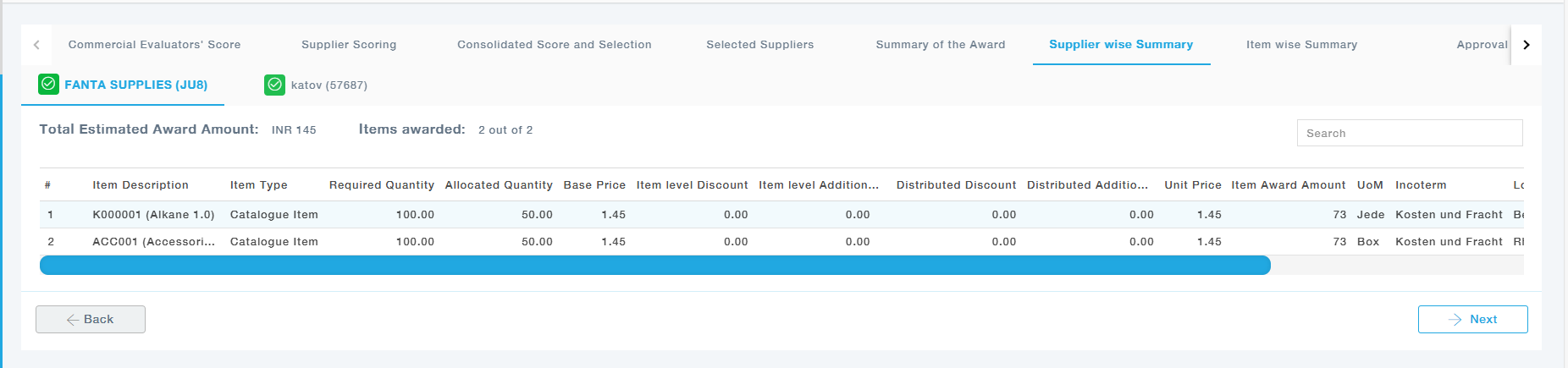 A detailed breakdown of the items awarded to each supplier is shown here, including item quantities, prices, units of measure, and delivery terms (Incoterms), ensuring clarity on distribution.