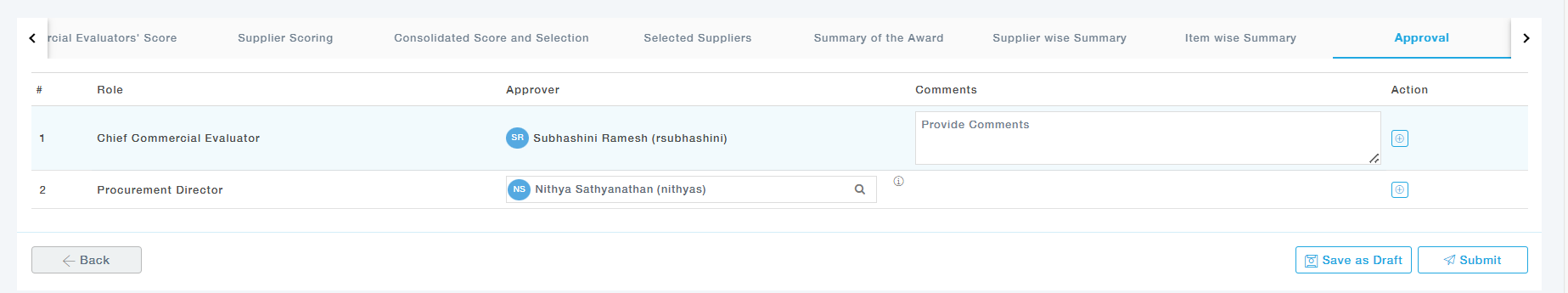 At this stage, the Chief Commercial Evaluator reviews the commercial scores submitted by individual evaluators. The scores are based on predefined weightages and supplier quotes, and the Chief ensures consistency and fairness before proceeding
