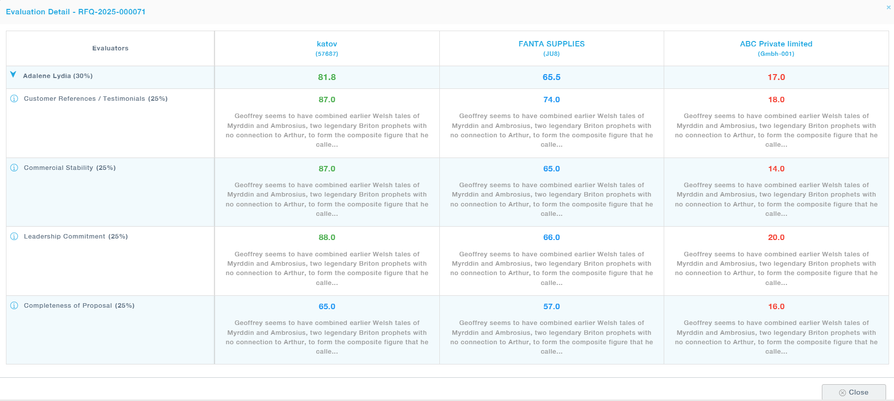 The Evaluation Detail page provides a detailed breakdown of scores assigned to each supplier by individual evaluators. It lists all evaluation parameters along with their respective weightages, the scores awarded for each parameter, and evaluator comments explaining the rationale behind the scoring. This view enables stakeholders to compare supplier performance side-by-side across all criteria, ensuring transparency, consistency, and traceability in the RFQ evaluation process.