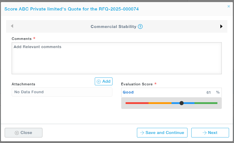 For each supplier, the system will display the predefined evaluation parameters (e.g., Commercial Stability, Customer References / Testimonials, Leadership Commitment) along with their assigned weightage. For every parameter, you must enter relevant comments in the Comments field, attach supporting documents if necessary, and use the score slider to assign a percentage score. Once you have entered the score and comments, click Save and Continue to move to the next parameter until all have been completed.