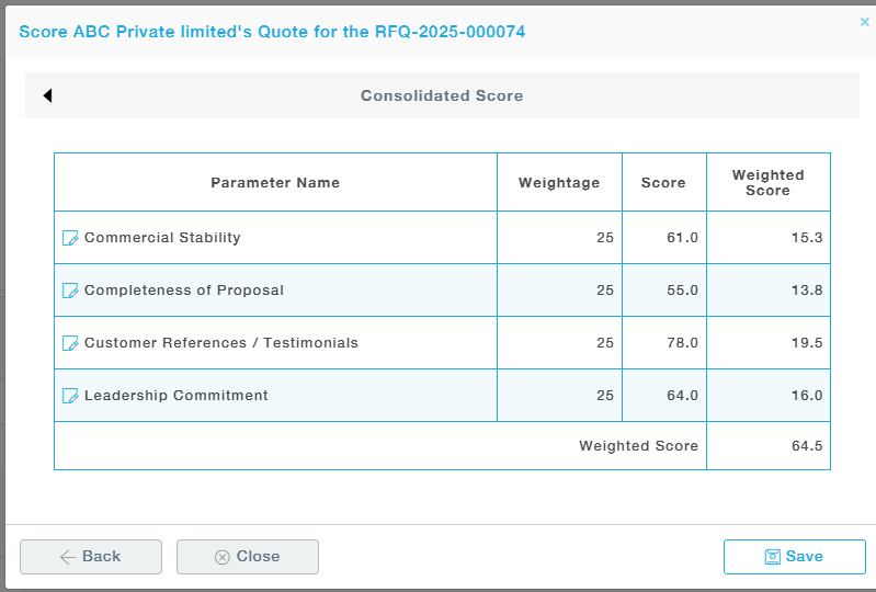 Once all parameters for a supplier have been scored, the system will generate a consolidated score tables showing the parameter name, its weightage, the score given, and the calculated weighted score. Review these figures to ensure accuracy and completeness. If everything is correct, click Save to finalize the evaluation for that supplier.