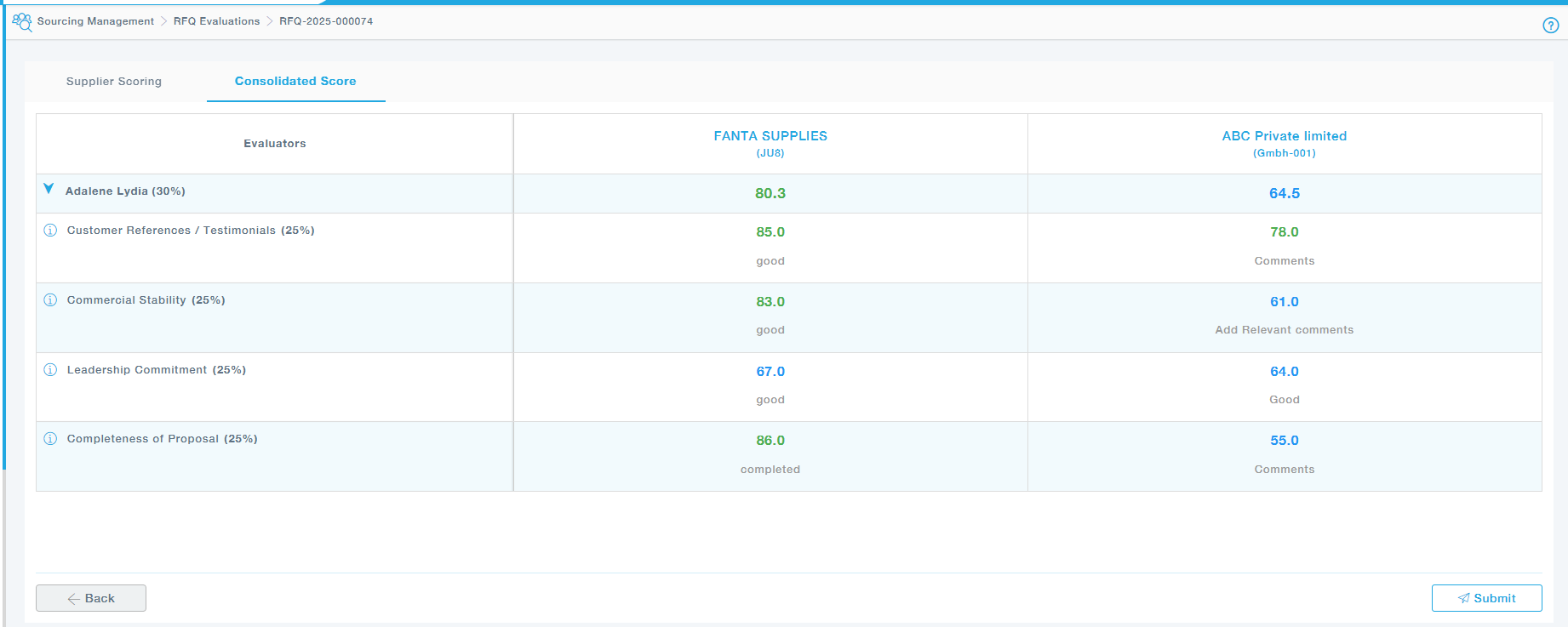 Navigate to the Consolidated Score tab to view a side-by-side comparison of all suppliers’ scores. This tab breaks down scores by evaluator and by parameter, making it easier to identify performance differences. You can also check the status of evaluations to ensure that all evaluators have submitted their inputs for each parameter. Once all evaluators have completed their scoring for every supplier and parameter, click Submit to finalize and record the evaluation results.