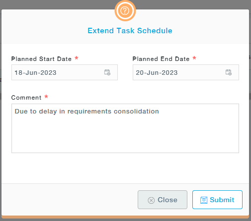 - Extend Schedule: Provision to modify the Planned Start and End Date of the task and provide comments.