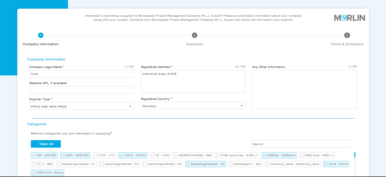 The form appears as below with three different tabs, the first tab asks for the basic details such as company information, Material Categories that are being Supplied, Add Documents, and Contact Information of the Supplier. Additionally, if you need to Validate the DUNS number, you have the provision to validate the DUNS number you have entered by clicking on the verify button beside the DUNS number.