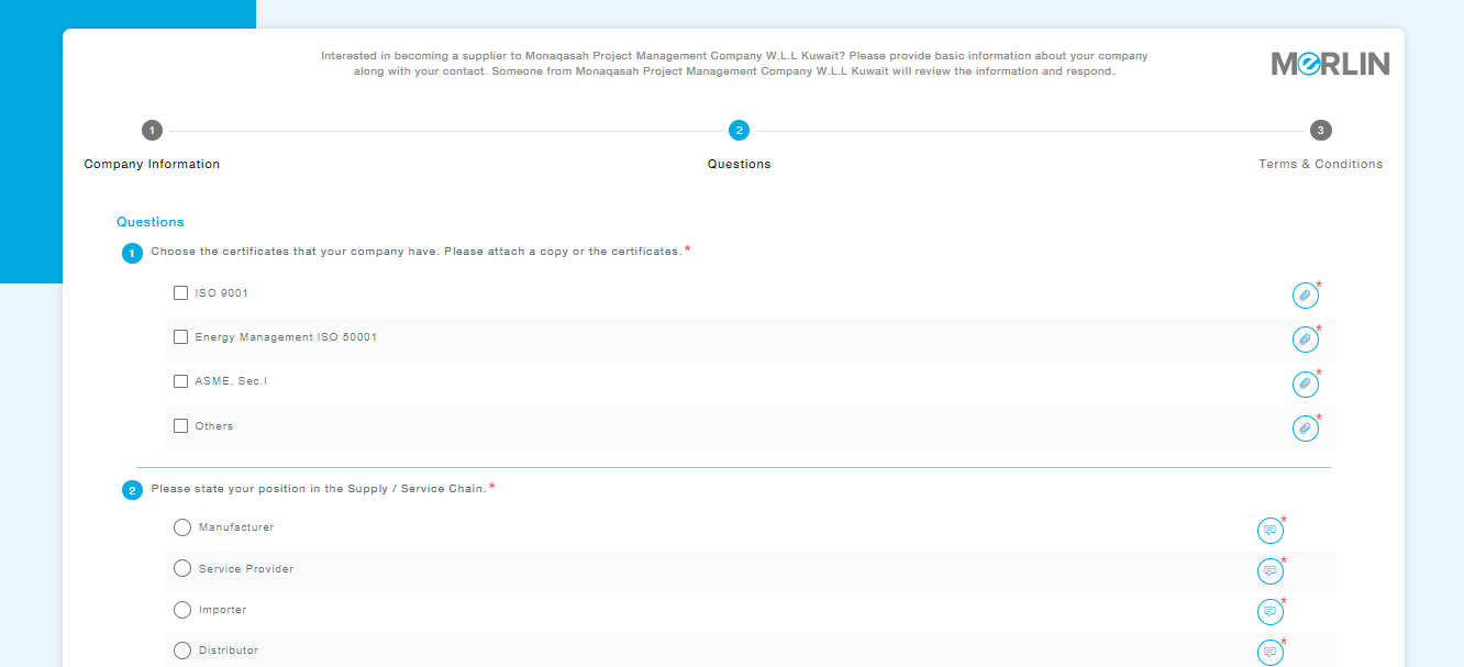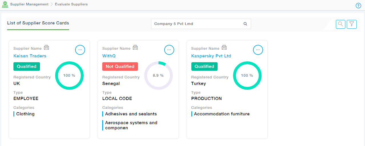 Some suppliers would have shown interest in supplying items to your organization. The suppliers can use the interested supplier link and express their interest by providing the required details asked in the Interested Form in such cases. The details of this form are further integrated into Merlin and made available in the Evaluate Suppliers submenu. Also, this submenu contains the scorecard of the Suppliers, who have already answered the Questionnaire/Compliance Survey sent from the Onboard Supplier submenu.