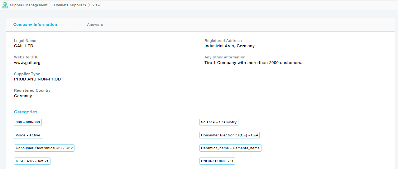 Provision to View the details provided by the Interested Supplier. The first tab provides the Basic Company Information and the Qualification Questionnaire tab displays the answers provided by the Supplier if the Qualification questionnaire is enabled. Similarly, if the Supplier is requested to respond to the Onboarding Compliance Survey, the response provided by the Supplier will appear under the Compliance Survey tab. You can also view the comments, and attachments provided by the Supplier.