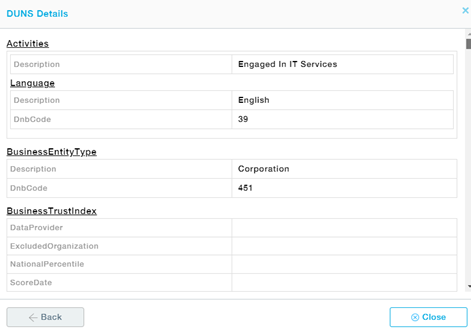 Choose the types of information (Data sets) to be collected from DUNS for the Supplier and Proceed. The DUNS details will then be displayed.