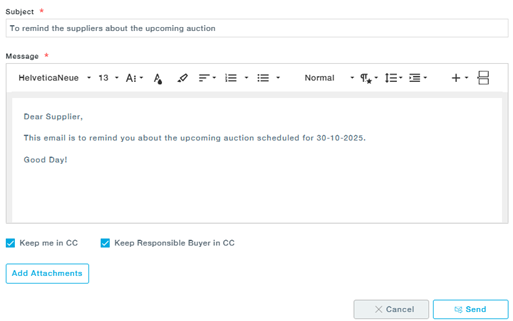 - (Optional) Select to include the user and/or the responsible buyer in CC (To reduce unnecessary email traffic to senders and responsible buyers, ensuring targeted and efficient communication.)
