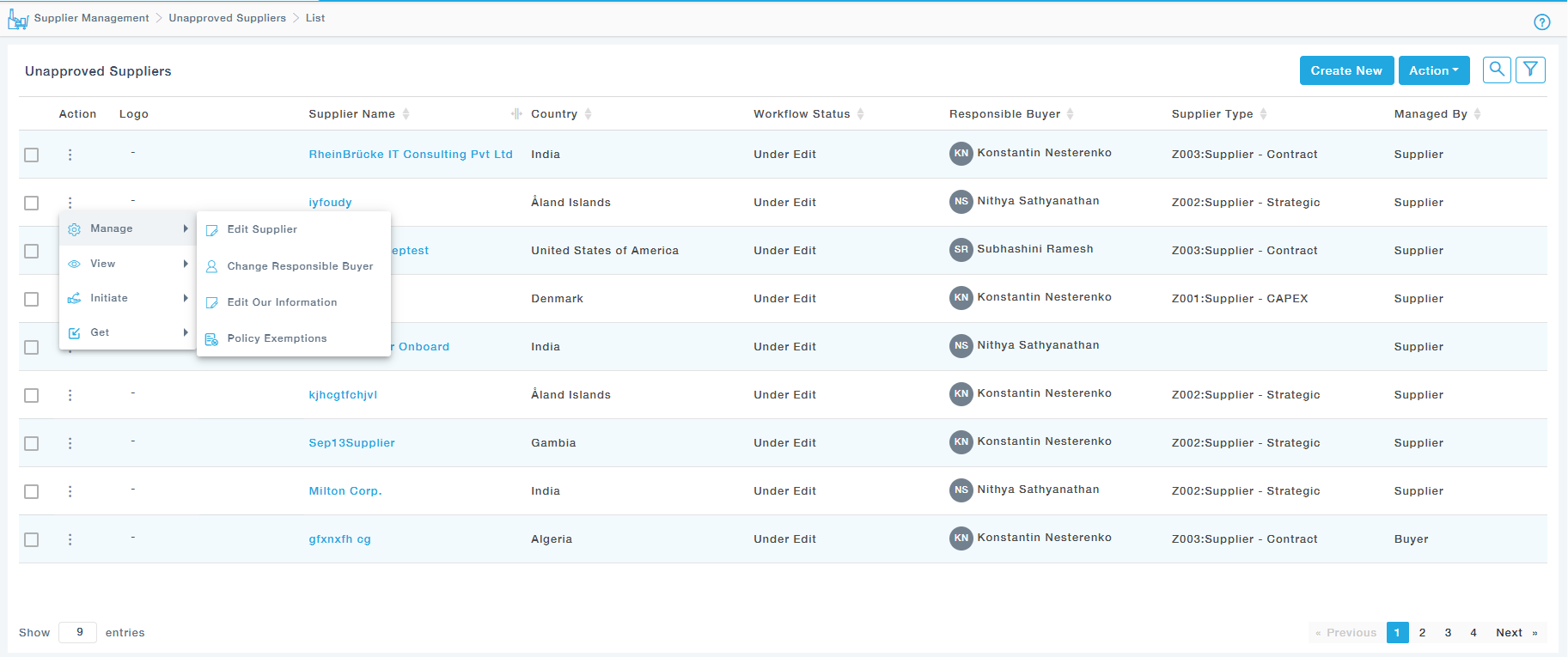 The Action button on the top right can be used to Change the responsible buyer of selected Suppliers, also it will let you download the complete list of Unapproved Suppliers in the form of an excel. This excel will be sent to the email of the Responsible Buyer.