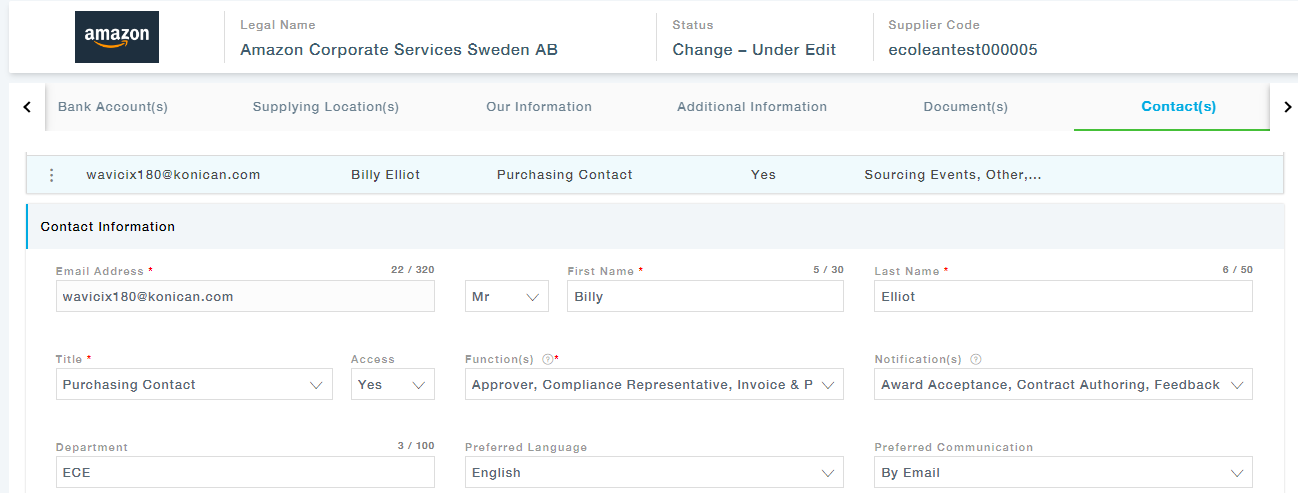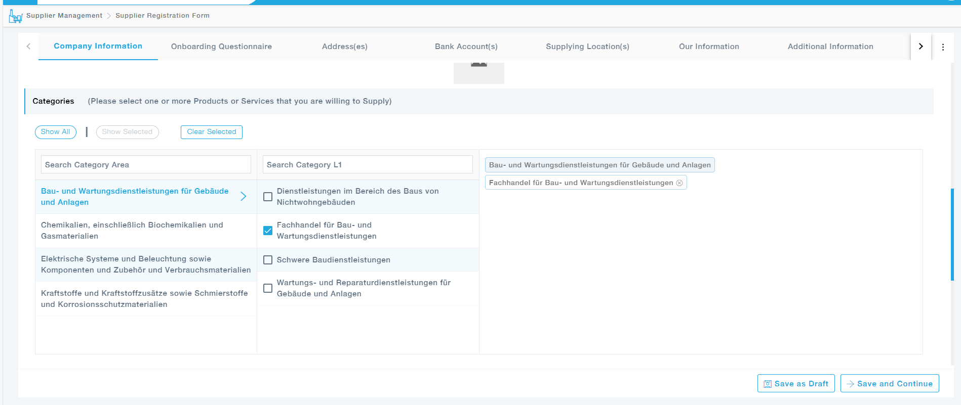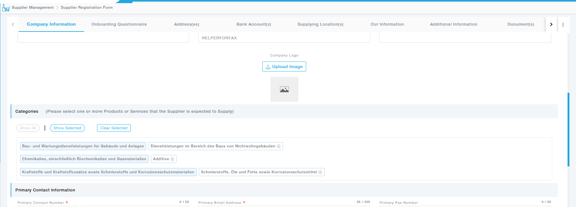 - When the supplier fills the registration form, and if the categories pre-selected by the buyer during the invitation process will be automatically populated as specified below. The supplier may review and modify these selections as needed