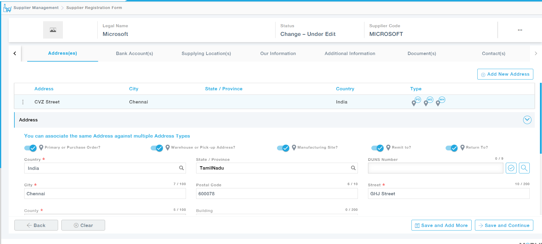 Choose the type of address, whether Primary/Remit/Manufacturing/Warehouse/Return address and then provide the address. Enter the DUNS number. You can also provide the address in the Local Language. Once the address is provided, click on the Save and Continue to save the address and move to the next tab or Save and Add More button to add more addresses. You can add multiple addresses under the Addresses tab. You can choose the precise location with the help of integrated google map.