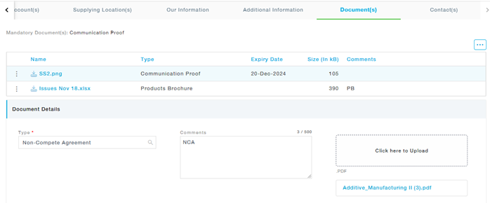 After providing all relevant information, the supplier will need to attach relevant documents to support the information provided. The documents can be uploaded using this tab.