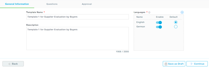Supplier Performance Evaluation or the Voice of the Buyer Templates are created under this menu. Such Templates will be multi-lingual.