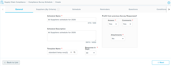 - Provide the Survey Schedule Name, and detailed description, choose the survey template, and select the expected “Survey response in days”. Choose whether the answers, comments, and attachments from the supplier’s previous response should be carried forward into the current survey.