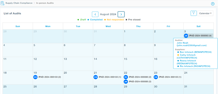 - The compliance officer creates an in-person audit for one or more Suppliers and chooses auditors at the Supplier level and assigns a planned end date or response due date.